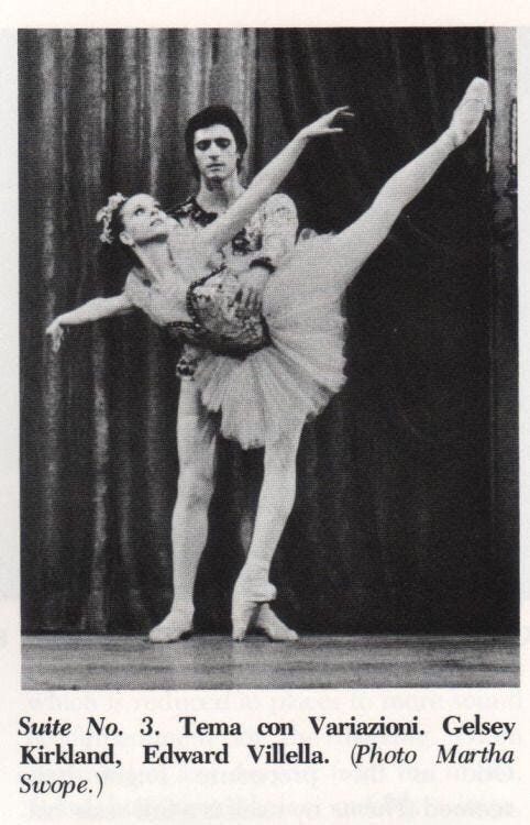 After the ballet was made at A.B.T. in 1947, Balanchine brought it to N.Y.C.B. in 1960, starring Verdy and Edward Villella. In 1970, he choreographed the first three movements of Tschaikovsky’s Suite No. 3, and restaged Theme and Variations with Kirkland and Villella leading.