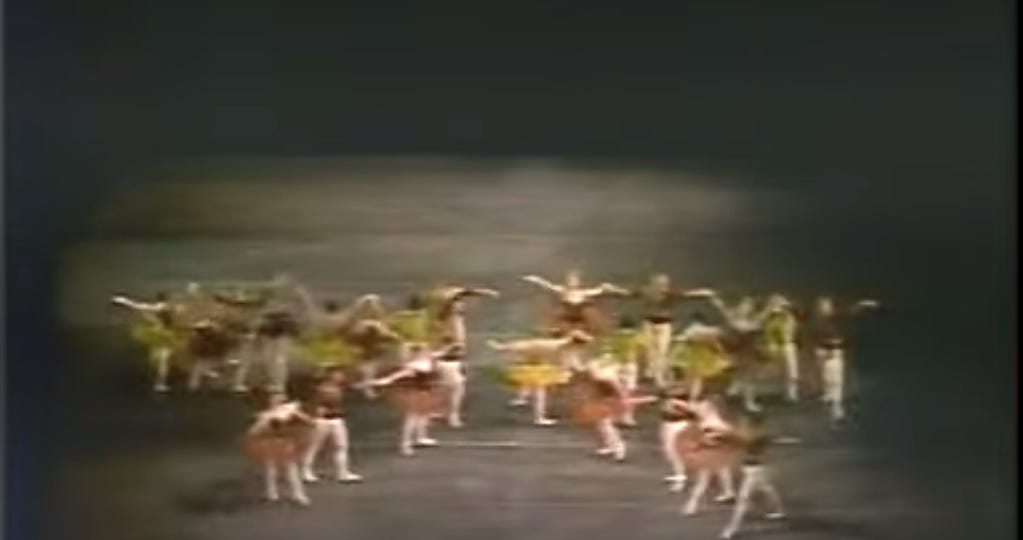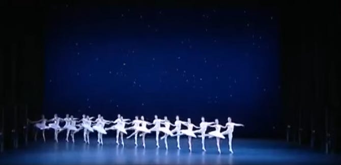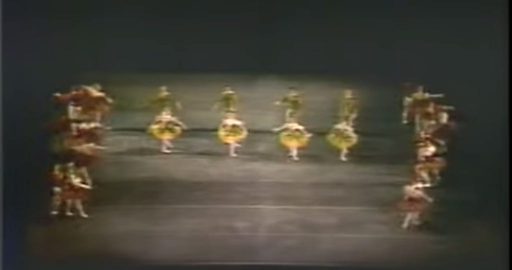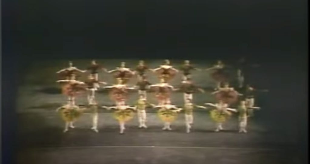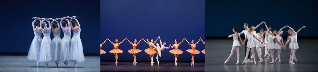And they take full advantage of it, taking up all of the space in high arabesques and jumps. While always original (that’s why his work is so genius!), this is textbook Balanchine corps work: allowing the masses to do principal-caliber choreography, shifting panels and reinventing endless new ways to break up and rearrange bodies on a stage. Another similarity Theme has to other ballets Balanchine choreographed in the era like “Serenade” and “Concerto Barocco” are his daisy chains- “Theme has a famous one, where the ballerina performs adagio on pointe supported by bourreeing corps girls, proving that, as a ballerina in Balanchine’s work, she doesn’t need a man to be supported, strong, and beautiful - he is just the gold setting for her diamond.
