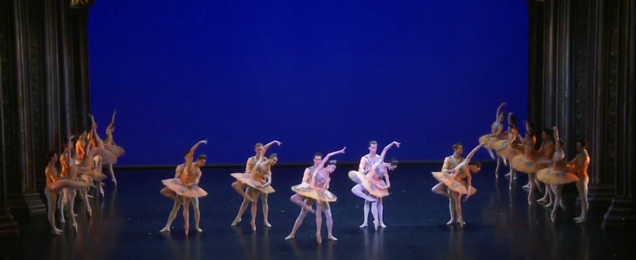 This also a moment where we see Balanchine’s famous arithmetic: three rows of eight, or four lines of three couples, shifting to become two columns of four couples and then two lines of four demi-soloist. Throughout the ballet, almost every possible configuration of these dancers is utilized, smoothly and roundly, in a way that’s satisfying to watch but difficult to realize unless you pay close attention. One of my favorite moments is when the whole cast forms a diagonal line, to polonaise in pairs. It reminds me of an iconic moment in Balanchine’s Diamonds, another ballet to Tchaikovsky .