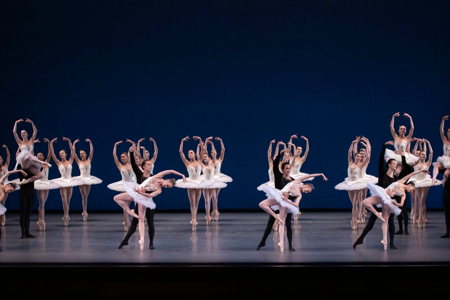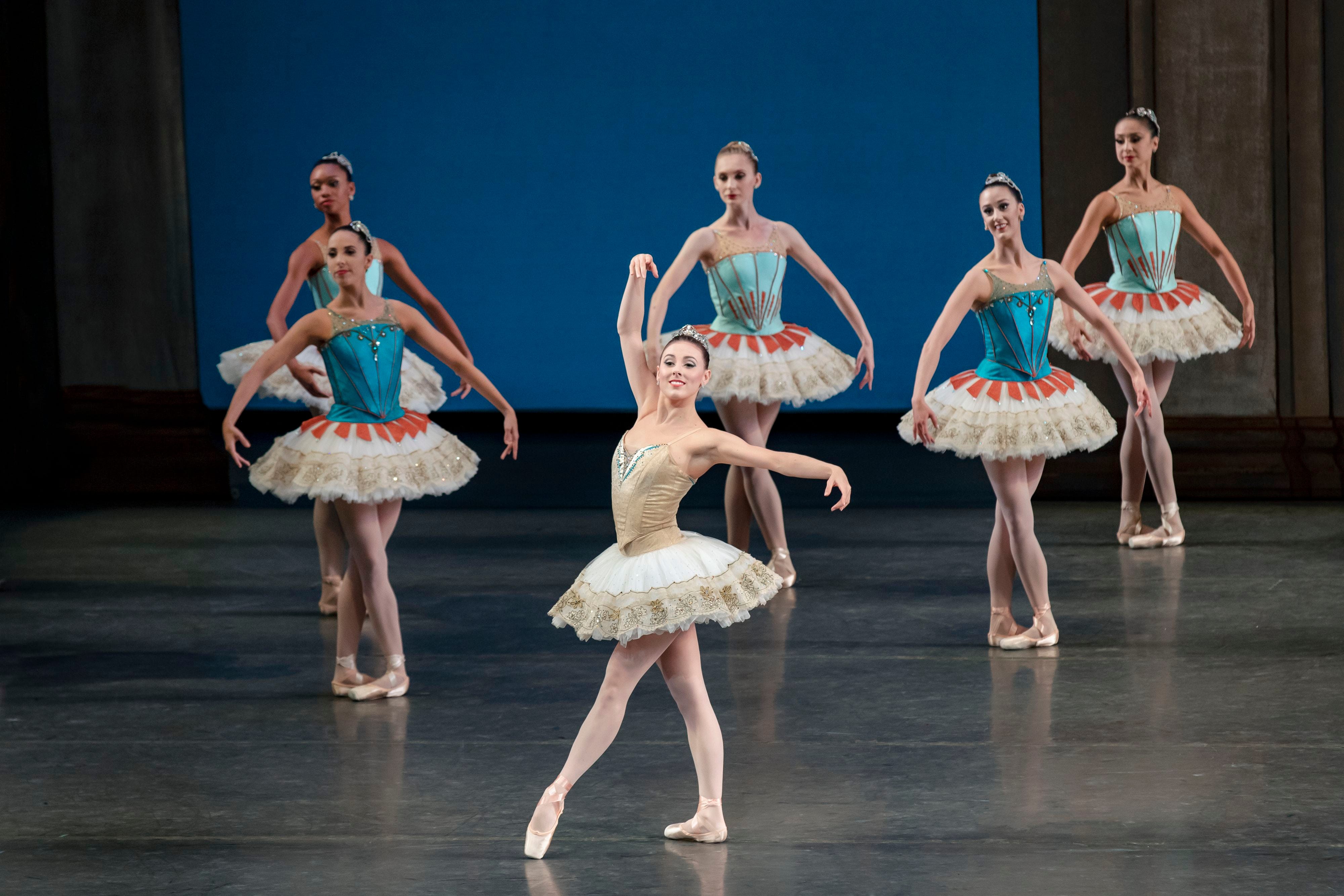 At the start of the finale, when the principal couple rejoins the ranks, we see a prime example of Balanchine’s choreographic experimentation: taking a classic position- here, passe releve- and tilting it off its axis.