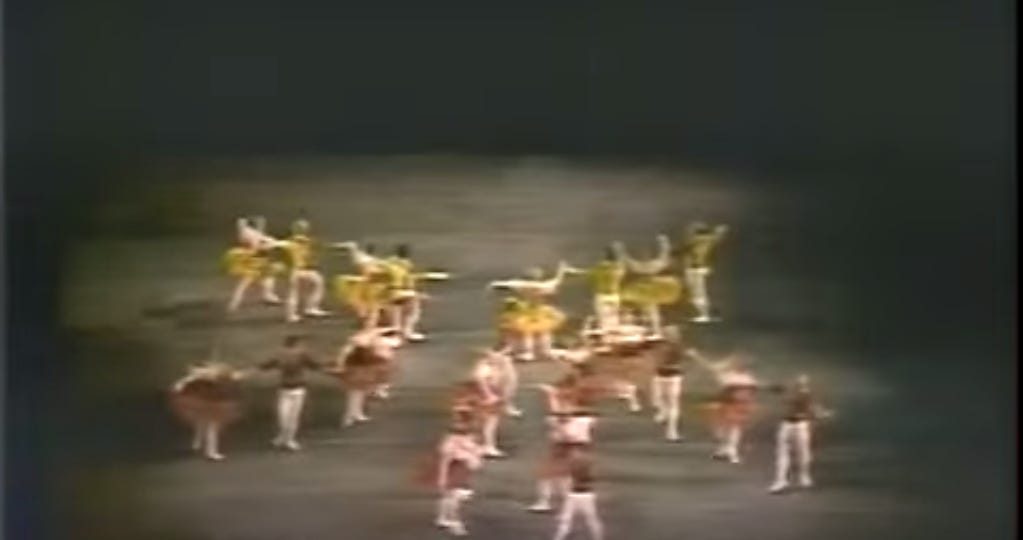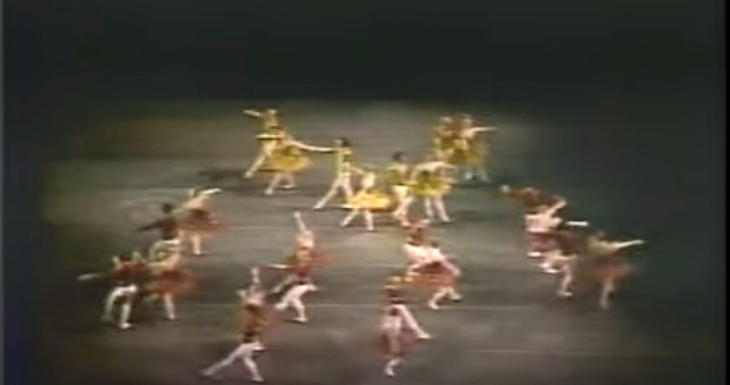 I particularly like the above video, featuring Kirkland and Mikhail Baryshnikov, because the vantage point and the bright red and orange tutus allow for a full enjoyment of the choreography. As someone who is more often in the third or fourth ring than anywhere else at N.Y.C.B., I can attest that there are big benefits of being further away from stage.